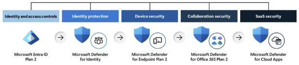- Entra ID P2: Risikobasierter bedingter Zugang, Einblick in riskante Anmeldungen und Verhaltensanomalien. Identitäten werden über den gesamten Lebenszyklus verwaltet, besonders kritische Administratorenrechte besonders geschützt – was das Risiko gestohlener Identitäten stark verringert.
