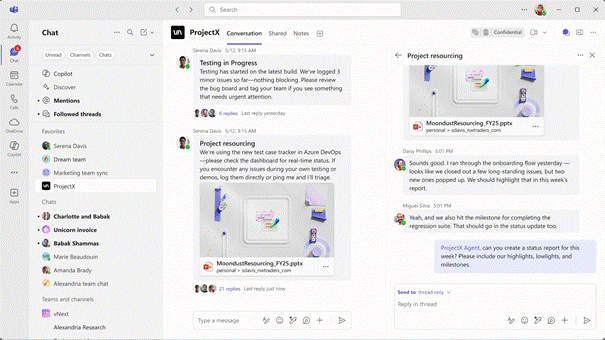 Jeder Kanal kann einen Channel Agent haben, der auf den enthaltenen Gesprächen, Dateien und Besprechungen basiert – sozusagen ein Fachexperte für das Team. Der Channel Agent ist mit einer Copilot-Lizenz verfügbar und erstellt jetzt Statusbericht-Updates und Arbeitspläne.